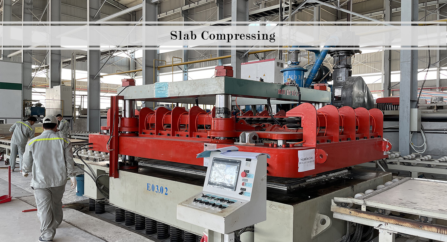 Pressing The slab is then compacted by a special vacuum and vibration process at a pressure of 100 tons. |