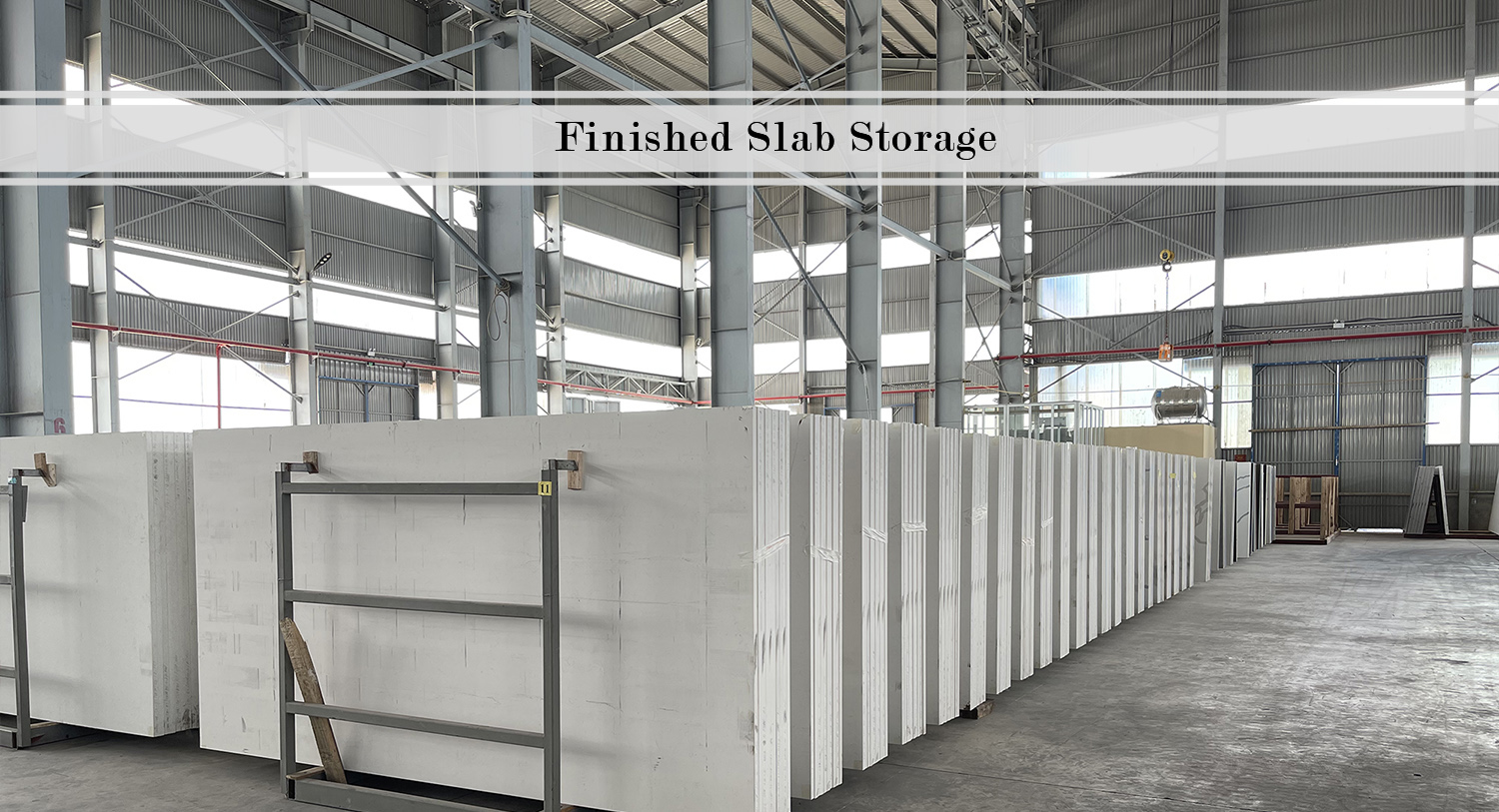 Molding The mixture is then poured into a mold and formed into slab sizes of 303x142cm or 323x162cm(119x56 inches or 127x64 inches). |